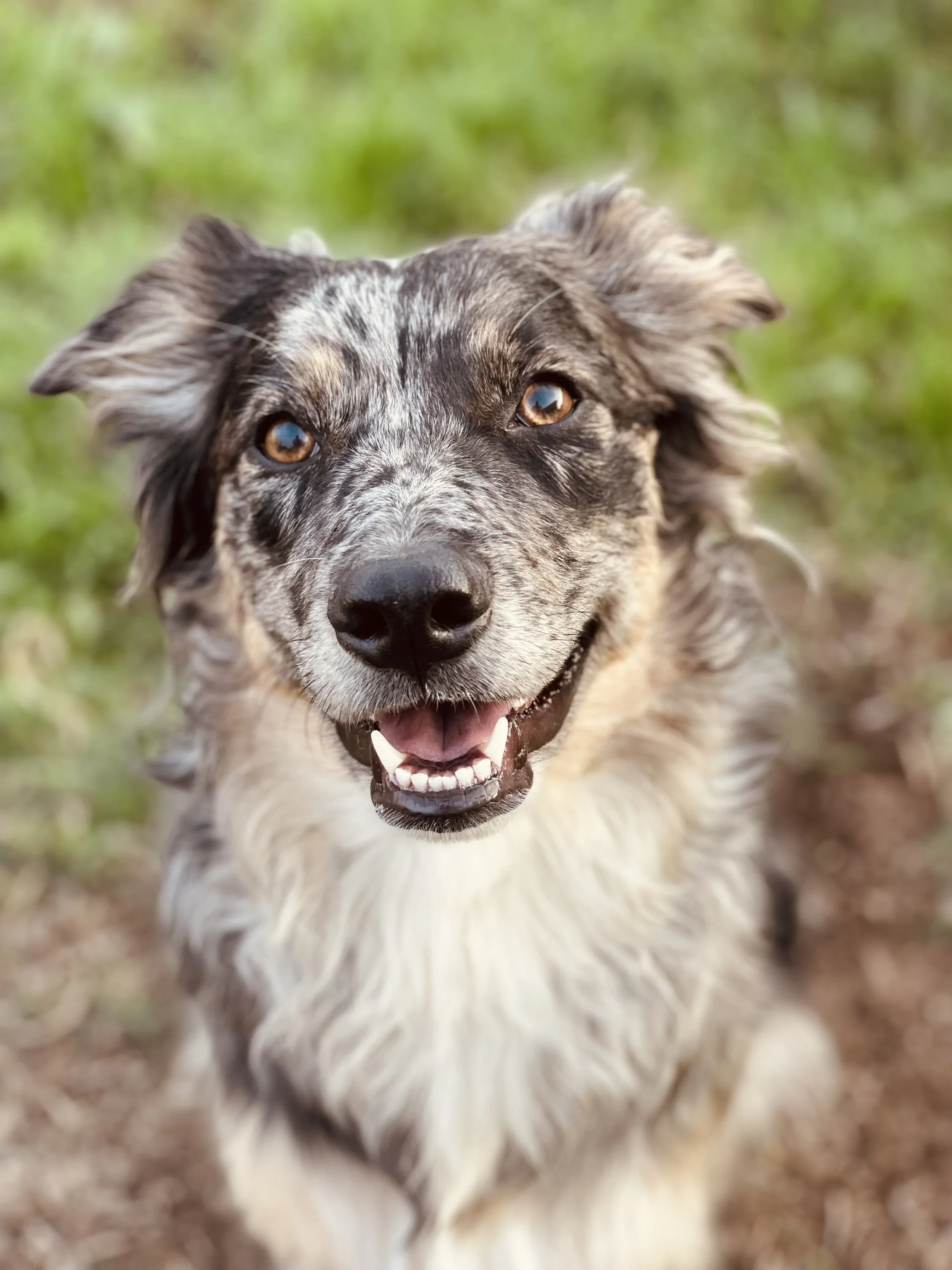 Rylee is the first merle that we got and she knows how beautiful she is. She is 19in tall and weighs about 45 pounds. She is the mom to everyone in the group and is constantly doing mouth and ear cleanings on all the other girls, even on the humans if she sneaks up on us. She is a cuddle bug through and through, but being the fluffiest of the bunch she gets hot pretty quickly and needs a personal fan to keep her happy.